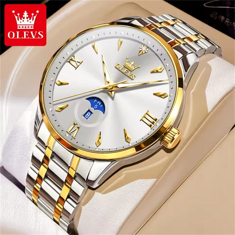 OLEVS 3678 Moon Phase Watches Waterproof Silver Gold Black.