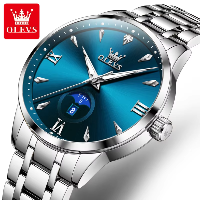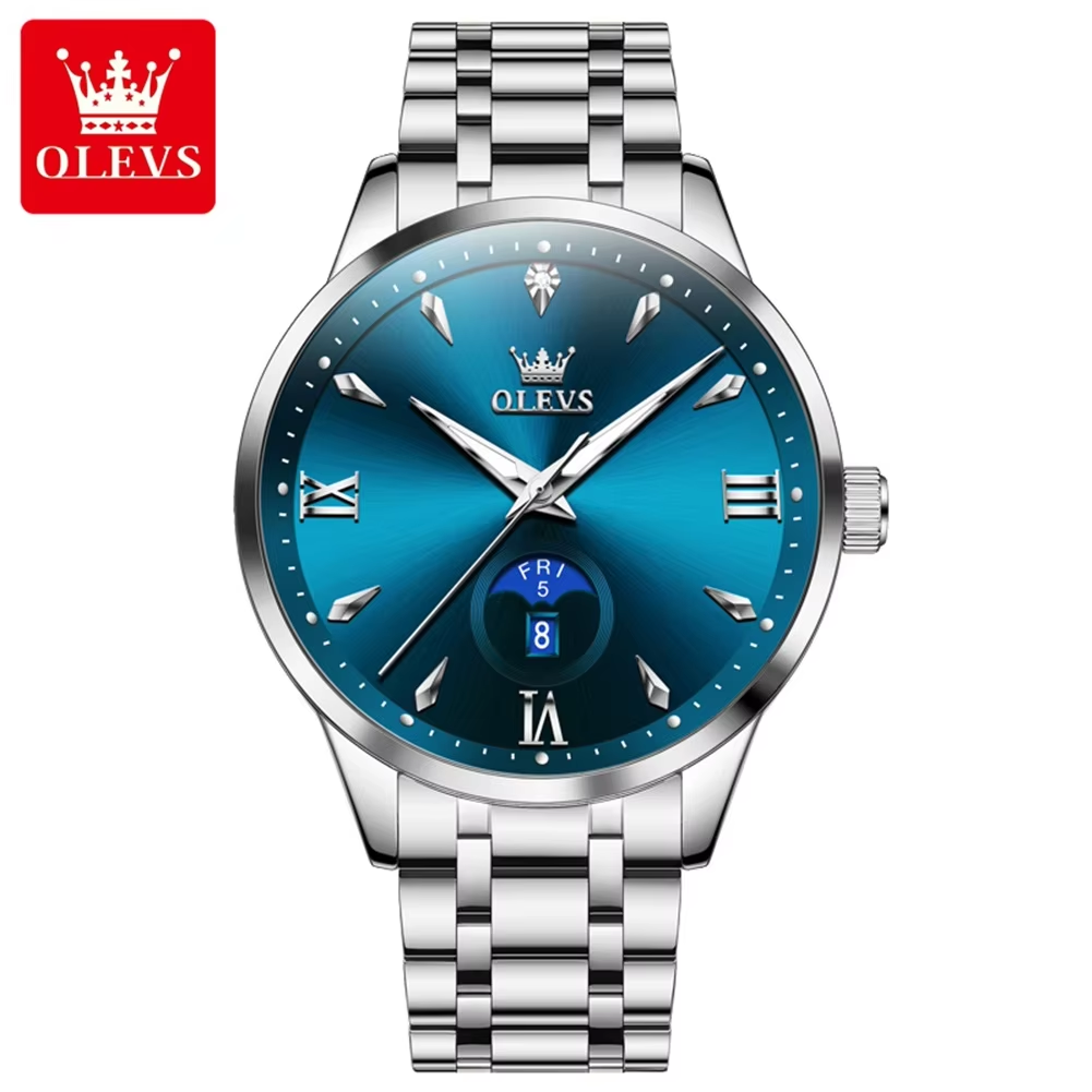 OLEVS 3678 Moon Phase Watches Waterproof Silver Gold Blue.